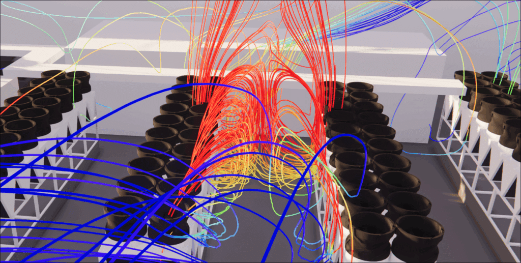 Finalmente, é essencial ter temperaturas uniformes em toda a sala, para evitar movimentos de ar problemáticos causados pela estratificação térmica. Por conseguinte, é necessário encontrar um equilíbrio entre um caudal de ar fresco suficiente para assegurar o arrefecimento necessário e velocidades do ar suficientemente baixas em todos os pontos da divisão. A tomada em consideração destes diferentes fenómenos permite um melhor controlo das condições térmicas e do fluxo de ar, garantindo um desempenho ótimo e uma maior segurança das instalações.